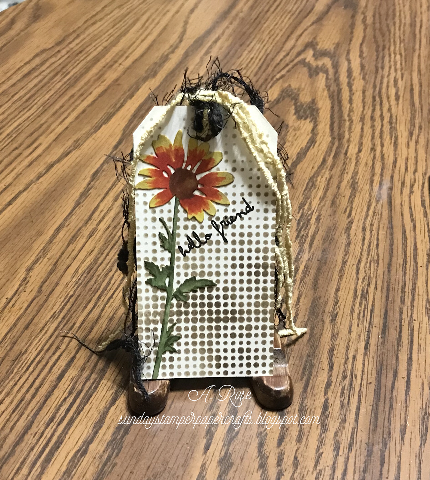 The next tag I stenciled with Distress ground espresso ink and Tim Holtz “Dot Fade Layering Stencil”.